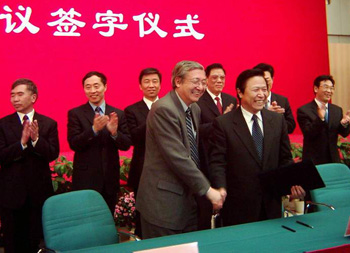 江蘇省省長梁保華與北大校長許智宏分別代表江蘇省和北京大學簽署了《江蘇省人民政府 北京大學合作協(xié)議》。