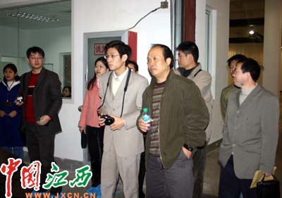 鐘虹光(前右二)帶領媒體記者參觀江中藥廠生產車間