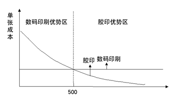 下面舉例說明二者所具有的市場互補性。短版印刷最突出的優(yōu)勢就是方便、快捷,當(dāng)然在成本上也比長版印刷高,具體高多少,無法簡單衡量,主要依印量而定。數(shù)碼印刷的成本是固定的,無論印多少,單張成本不變,但是長版印刷由于存在版費,使得單位成本隨著印張的增加而減少。舉個例子,制版花了1200元錢,僅印一本,總的制版費就是1200塊一本,而印10本,100本,1000本,版費就被分?jǐn)偭耍瑔伪镜某杀咀匀痪徒迪聛砹耍吭酱笤奖阋耍圆蝗菀子嬎憔唧w的成本。根據(jù)數(shù)碼印刷經(jīng)營者的經(jīng)驗判斷,如果印張在1000以上,90%以上的客戶都會選擇長版印刷,因為它的成本會比短版低得多,當(dāng)然不排除有客戶因為時間的關(guān)系選擇短版印刷,畢竟出片、打樣、簽樣都很耗費時間。2004年以后,北京、上海等城市的數(shù)碼印刷發(fā)展較快,目前比較公認(rèn)的是一般印張在500左右時數(shù)碼印刷和膠印的單價趨同,如果再考慮時間因素,膠印不存在優(yōu)勢。二者互補性的圖示如下: