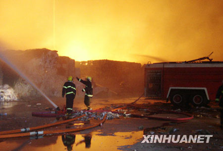 消防隊員在江蘇常熟理文造紙廠火災現(xiàn)場撲救大火