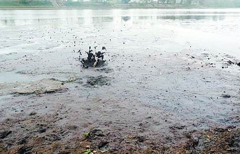 3月5日下午,記者在距離桂海鐵路漓江大橋下游約150米處,見(jiàn)到了污水排放口。記者看到,污水排放口周圍的江面形成幾百平方米的淤泥,呈現(xiàn)暗紅色或深藍(lán)色。記者拋出一塊鵝卵石,江面淤泥四濺,并散發(fā)著一陣陣臭味。