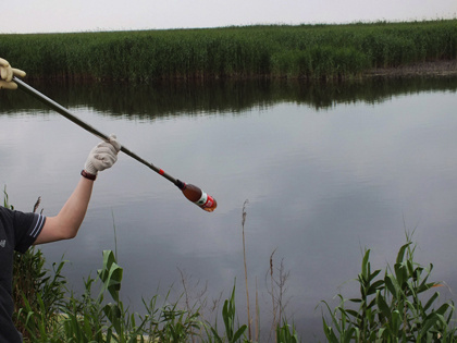 蘆葦蕩中一條條交織錯綜的黑色水渠如一條條黑色巨龍,在無邊的蘆葦蕩中瘋狂肆虐……好一幅“天蒼蒼,‘蘆’茫茫,風吹‘葦’低,見‘黑龍’”的景象!當地農民說:“這一片都屬于保護區范圍,蘆葦蕩下面原來都是自然生態清水,能夠養魚,過飛的鳥兒都喜歡停留;現在幾萬畝蘆蕩下面排的全是黑色污水,魚和其它水生動物幾乎沒了,能抗過污染存生的魚也不能吃;過飛的鳥兒幾乎不再停留。為污染保護區的事,已經有多家媒體來曝光過,但都沒用!”