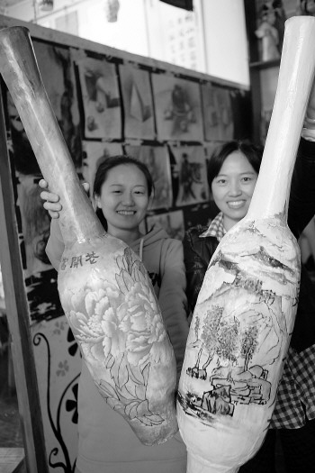 10月21日,襄陽陽光未來美術(shù)學(xué)校的青年教師展示她們制作的仿古紙質(zhì)“青花瓷”花瓶。