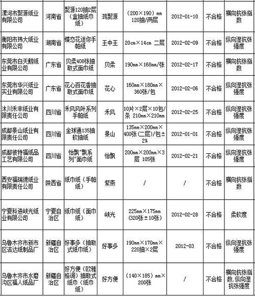 此次不合格產品規格為:潔達紙制品廠生產的190mm×170mm×220抽×2層的好事多牌抽取式紙巾紙,不合格項目為縱向濕抗張強度;福人紙品廠生產的(140×185)mm×200張的好方便牌歐雅格調抽取式紙巾紙,不合格項目為橫向抗張指數和縱向濕抗張強度。