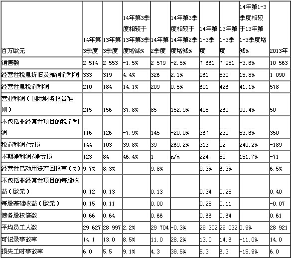 銷售額為76.61億歐元(2013年為79.51億歐元),經營性息稅前利潤為6.01億歐元(2013年為4.26億歐元),主要歸因于實現成本降低。