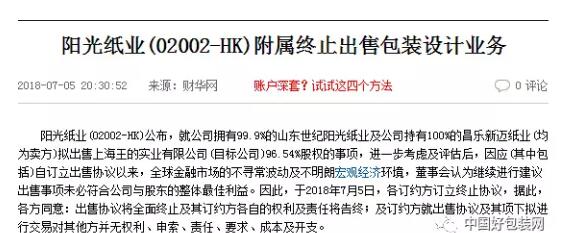 6月12日,陽(yáng)光紙業(yè)發(fā)布公告,將以人民幣3.5億元出售上海王的實(shí)業(yè)。有業(yè)內(nèi)人士分析認(rèn)為,這或是為上海王的實(shí)業(yè)獨(dú)立上市做準(zhǔn)備。 但到了7月5日,事態(tài)又生變化,陽(yáng)光紙業(yè)發(fā)布最新公告,表示將終止出售包裝業(yè)務(wù)。