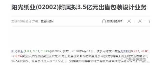 陽(yáng)光紙業(yè)6月份曾公告,將以3.5億出售上海王的實(shí)業(yè) 據(jù)了解,在6月12日,陽(yáng)光紙業(yè)曾公告,上海魯達(dá)紙制品擬向山東世紀(jì)陽(yáng)光紙業(yè)(公司持有99.9%)及昌樂(lè)新邁紙業(yè)(公司持有100%)購(gòu)買上海王的實(shí)業(yè)96.54%股權(quán),現(xiàn)金總代價(jià)人民幣3.5億元。