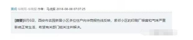 8月6日,西安市名園新居小區(qū)多位住戶反映,緊鄰小區(qū)的印刷廠噪音和氣味嚴(yán)重影響正常生活。日前,經(jīng)由西安市環(huán)保局高新分局做工作,被投訴印刷廠17日中午起正式停產(chǎn)。  印刷廠遭投訴,環(huán)保局要求先停業(yè)停產(chǎn),限期徹底搬離 8月17日上午,西安市環(huán)保局高新分局在名園新居小區(qū)貼出了公告。根據(jù)該公告介紹,8月16日9:30-10:30,環(huán)保高新分局聯(lián)合高新行政審批局對(duì)被投訴的印刷廠開(kāi)展了環(huán)境監(jiān)察工作。 該廠包含1號(hào)樓(東側(cè))2號(hào)樓(西側(cè))兩個(gè)車(chē)間,1號(hào)樓主要為辦公及手工裝訂車(chē)間。現(xiàn)場(chǎng)要求該公司負(fù)責(zé)人先期停業(yè)停產(chǎn),限期徹底搬離。 被投訴公司同時(shí)也在小區(qū)貼出了承諾書(shū),表示決定于2018年8月17日中午12點(diǎn)前對(duì)子公司1、2號(hào)樓印刷生產(chǎn)設(shè)備正式停產(chǎn),斷水?dāng)嚯姡謇韽S區(qū)所有的原材料。 后續(xù)子公司將所有的印刷設(shè)備進(jìn)行逐步搬離。計(jì)劃在9月30日之前印刷設(shè)備徹底清場(chǎng)搬離。 手續(xù)沒(méi)有任何問(wèn)題,解決的辦法就是讓印刷廠搬遷 據(jù)悉,該公司為陜西盛世大宇印務(wù)有限公司。穆姓負(fù)責(zé)人在遭投訴時(shí)說(shuō),印刷廠所在的地方是雁塔區(qū)工業(yè)園,公司營(yíng)業(yè)執(zhí)照、環(huán)評(píng)報(bào)告等都齊全。在環(huán)保方面今年一直在整改,加裝了廢氣凈化設(shè)備、封窗隔音等。詳見(jiàn):印刷廠氣味、噪音擾民遭舉報(bào)。