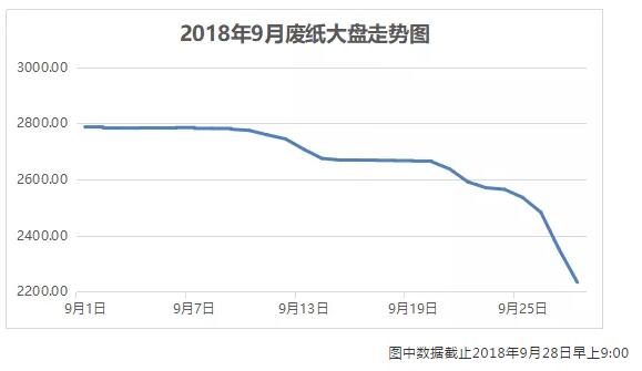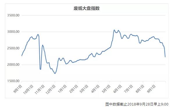 9日之間,黃板類價格下跌650-800元/噸不等。單次下調價幅度更是從20日的30元/噸飆升至28日的300-350元/噸。 截至2018年9月28日早上9:00,廢紙價格指數跌至2233.87,并且還有繼續下跌的趨勢。 國慶過后廢紙價格還會反彈?