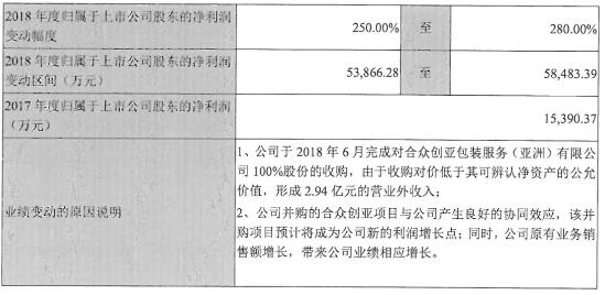 合興包裝預(yù)計(jì),2018年度歸母凈利潤變動(dòng)區(qū)間在5.39億-5.85億元之間,變動(dòng)幅度為250%-280%。業(yè)績變動(dòng)的原因主要有兩點(diǎn):