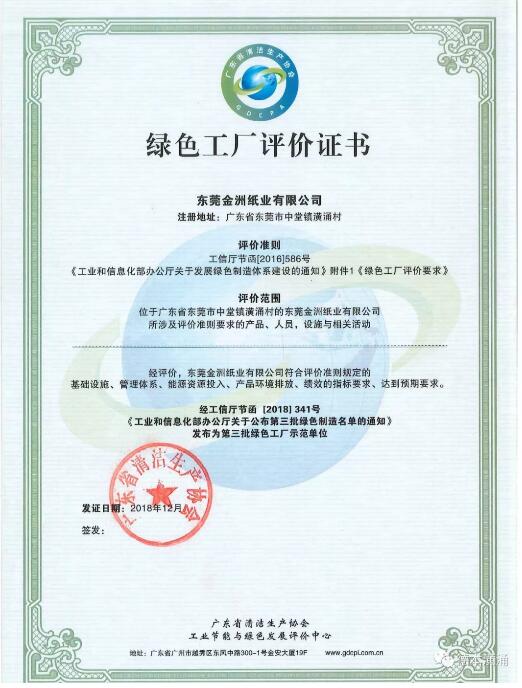 導(dǎo)語(yǔ):為進(jìn)一步推動(dòng)企業(yè)轉(zhuǎn)型升級(jí),提升工廠綠色制造水平,東莞金洲紙業(yè)有限公司于2018年3月開始籌備啟動(dòng)國(guó)家第三批“綠色工廠”的申報(bào)工作。東莞金洲紙業(yè)有限公司一直堅(jiān)持和踐行“綠色高效·環(huán)保·持續(xù)發(fā)展”的環(huán)保發(fā)展理念,在廣東省清潔生產(chǎn)協(xié)會(huì)的指導(dǎo)下,于2018年10月成功入選了由國(guó)家工信部公布的第三批綠色制造名單。2018年12月21日金洲紙業(yè)獲得了授牌。