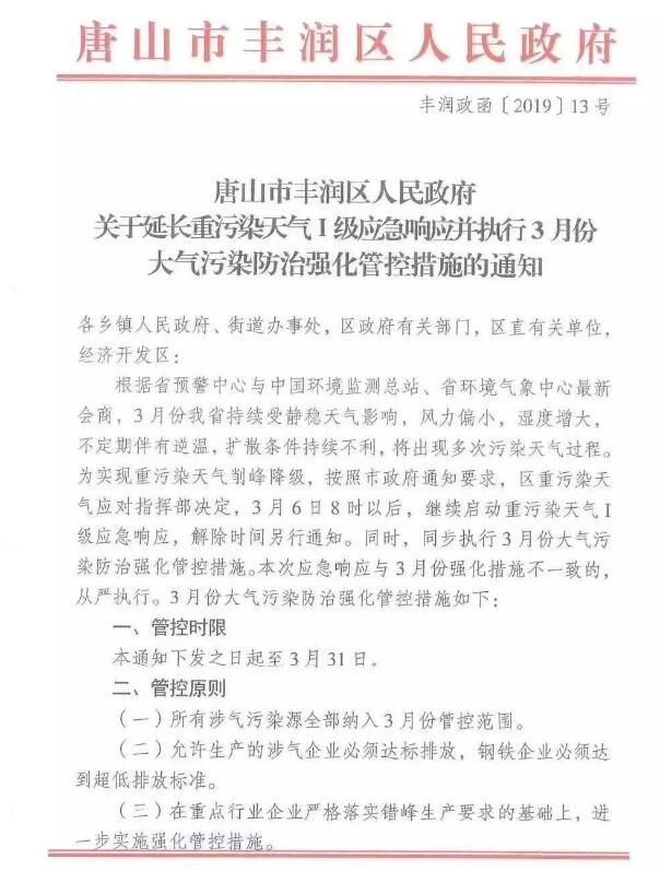 今年的環保行動,似乎比往年來得更猛烈。 2月下旬河北、山東多個城市啟動重污染天氣應急預警響應,不少制造業企業剛迎來節后開工就遭遇停產、限產。緊接著進入3月后,雖然山東因空氣好轉終止重污染停限產,不過唐山延長重污染響應,陜西多地啟動限產。 唐山:關于延長重污染天氣Ⅰ級應急響應的通知 按照唐山市人民政府2019年3月5日《關于延長重污染天氣Ⅰ級應急響應的通知》要求:唐山市重污染天氣應對指揮部決定,3月6日8時以后,繼續啟動重污染天氣Ⅰ級應急響應,解除時間另行通知,各項應急響應措施按照2月28日市政府《關于啟動重污染天氣Ⅰ級應急響應的通知》和市委辦公室、市政府辦公室《3月份大氣污染防治強化管控措施實施方案》(唐辦傳〔2019〕7號)的規定從嚴執行。