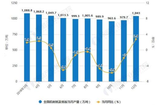 數據來源:公開資料、前瞻產業研究院整理 2018年全國機制紙及紙板產量已超億噸 據前瞻產業研究院發布的《中國造紙行業發展前景與投資戰略規劃分析報告》統計數據顯示,2018年1-3季度全國機制紙及紙板產量波動幅度較小,整體呈下降趨勢,2018年3-4季度全國機制紙及紙板產量下降;2018年12月全國機制紙及紙板產量為1043萬噸,同比增長2.8%。2018年1-12月全國機制紙及紙板產量為11660.6萬噸,同比下降1.5%。 2018年1-12月全國機制紙及紙板產量統計及增長情況