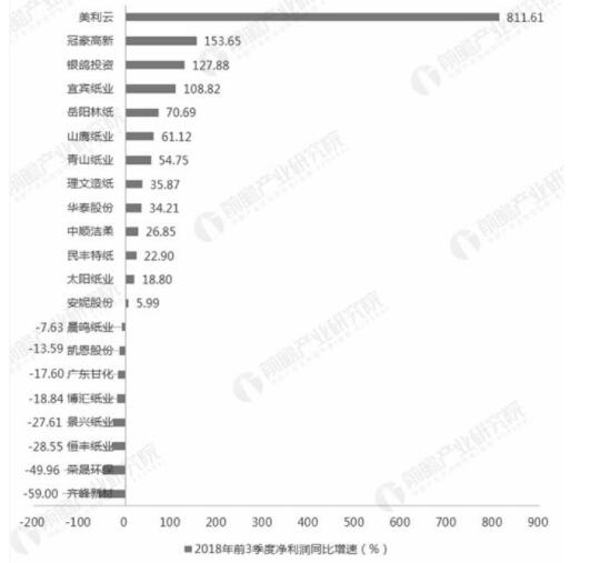 數據來源:前瞻產業研究院整理 (備注:1-2月、6月全國機制紙及紙板累計產量增速為-2.5%、-0.7%) 超1/3企業凈利潤同比下滑,業績表現欠佳 目前,包括港股上市的玖龍紙業和理文紙業在內,國內造紙行業的主要有22家上市公司。從2017年全年的業績表現來看,造紙行業2017年的業績表現普遍向好,所有公司的營收都有所擴張,其中僅安妮股份、廣東甘化2家公司的凈利潤出現下滑,數量占比不到10%。其中,年營收規模超過100億元的有6家公司,凈利潤規模突破20億元的有5家公司,玖龍紙業在營收規模和凈利潤規模上均遙遙領先與其他企業,穩居行業第一。總體來看,目前在營收和凈利潤規模處于行業領先地位的主要是玖龍紙業、晨鳴紙業、理文紙業、太陽紙業和山鷹紙業。 而從2018年前三季度造紙行業內企業的業績表現來看,相較于2017年同期出現了明顯下滑。具體來看,由于行業龍頭玖龍紙業未披露最新財務數據,所以僅對其余21家公司進行分析。在營收方面,明豐特紙、廣東甘化兩家公司同比出現下滑;凈利潤表現更糟,有8家公司凈利潤出現同比下滑,數量占比超過了1/3,利潤下滑企業中更是包括了晨鳴紙業和博匯紙業等營收體量較大的公司。因此,總體來看,2018年前3季度,我國造紙企業業績出現頹勢,發展面臨一定的困境,而這主要是因為原材料供給收緊和下游需求不振所致。 2018年前三季度21家造紙上市公司營收、利潤增速統計情況