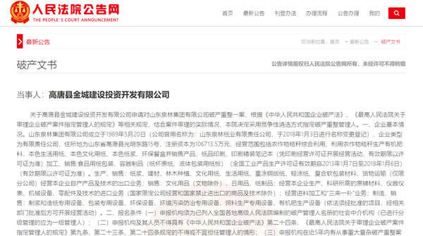 近日,據人民法院公告網獲悉,高唐縣人民法院19日發布關于高唐縣金城建設投資開發有限公司申請對山東泉林集團有限公司破產重整一案的公告。公告顯示,法院將結合案件審理的實際情況,采用競爭性遴選方式指定破產重整管理人。