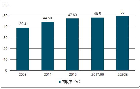 數(shù)據(jù)來(lái)源:公開(kāi)資料整理 三、回收 廢紙是許多國(guó)家爭(zhēng)奪的戰(zhàn)略性資源,是造紙工業(yè)最大的纖維原料來(lái)源之一。利用廢紙不僅可以制造再生包裝紙,還可用來(lái)制造再生新聞紙。需經(jīng)過(guò)脫墨、紙纖維的凈化和吸走油墨及雜質(zhì),然后造紙共四道工序。可以充分利用原料資源,降低生產(chǎn)成本,減少?gòu)U物的排放。根據(jù)生產(chǎn)實(shí)踐,使用1噸廢紙可以替代使用4—7立方米的原生木材。 我國(guó)廢紙回收率不斷提高,由2008年的39.40%上升到了2017年的48.50%。2017年初,國(guó)家工信部、商務(wù)部和科技部聯(lián)合發(fā)布了《關(guān)于加快推進(jìn)再生資源產(chǎn)業(yè)發(fā)展的指導(dǎo)意見(jiàn)》。意見(jiàn)提出,到2020年,國(guó)內(nèi)廢紙回收利用率要達(dá)到50%。 2008-2020年我國(guó)廢紙回收率趨勢(shì)