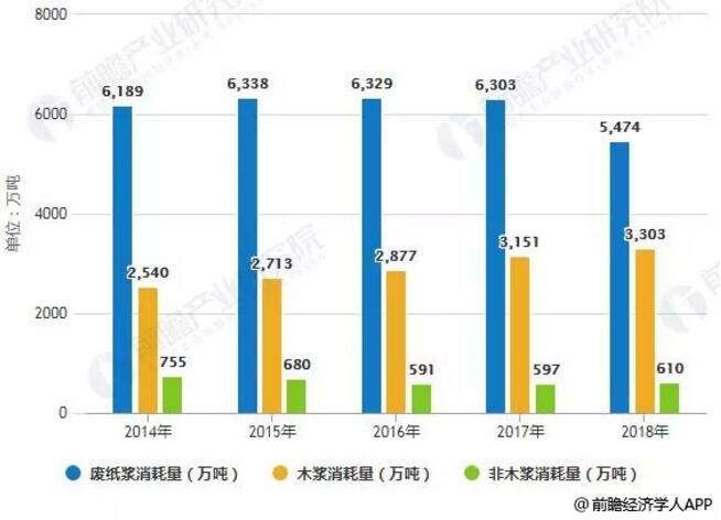 數(shù)據(jù)來源:前瞻產(chǎn)業(yè)研究院整理 目前,我國(guó)造紙用原料(木漿、廢紙和木片)對(duì)外依存度高達(dá)50%以上。其中,廢紙方面,2016年以前我國(guó)進(jìn)口廢紙制成的紙漿占紙漿總量的35%以上,但近2年這一比例已經(jīng)出現(xiàn)明顯的下降,2017年降為32.7%,2018年為27.2%,這也說明了國(guó)內(nèi)廢紙回收利用量有了很大的提升,這會(huì)為國(guó)內(nèi)廢紙回收利用市場(chǎng)提供了契機(jī)。 2014-2018年國(guó)內(nèi)外廢紙漿消耗結(jié)構(gòu)對(duì)比情況