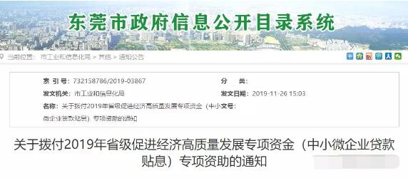 11月26日,廣東省東莞市工業(yè)和信息化局發(fā)布了《關于撥付2019年省級促進經(jīng)濟高質(zhì)量發(fā)展專項資金(中小微企業(yè)貸款貼息)專項資助的通知。通知顯示,東莞80家企業(yè)共獲專項資助合計2812.12萬元。