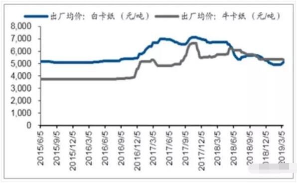 ▲中國貿(mào)易出口金額(累計值) 成本處于低位利潤彈性的邏輯依然成立,預(yù)計各紙包裝公司盈利能力會有同比提升。各類紙品紙價有所下滑,其中白卡紙下滑幅度較為顯著。目前國內(nèi)白卡紙出廠均價5100元/噸左右,遠低于去年年初6700元/噸的高價,上游成本下降不會快速全部傳導(dǎo)到下游定價,包裝類公司有望享受到其中一部分的利潤價值。