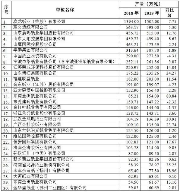 (四)紙及紙板主要產品2010~2019年進出口情況 1、新聞紙:2019年進口量大于出口量,凈進口量45萬噸。 2、未涂布印刷書寫紙:2019年進口量小于出口量,凈出口量31萬噸。 3、涂布印刷紙:2019年進口量小于出口量,凈出口量138萬噸。 其中:銅版紙:2019年進口量小于出口量,凈出口量95萬噸。 4、生活用紙:2019年進口量小于出口量,凈出口量75萬噸。 5、包裝用紙:2019年進口量大于出口量,凈進口量4萬噸。 6、白紙板:2019年進口量小于出口量,凈出口量133萬噸。 其中:涂布白紙板:2019年進口量小于出口量,凈出口量134萬噸。 7、箱紙板:2019年進口量大于出口量,凈進口量213萬噸。 8、瓦楞原紙:2019年進口量大于出口量,凈進口量154萬噸。 9、特種紙及紙板:2019年進口量小于出口量,凈出口量71萬噸。 (五)紙制品進出口情況 1、2019年紙制品進口量12萬噸,較上年減少6萬噸,同比增長-33.33%。 2、2019年紙制品出口量345萬噸,較上年增加22萬噸,同比增長6.81%。 六、紙及紙板生產布局與集中度 根據中國造紙協會調查資料,2019年我國東部地區11個省(區、市),紙及紙板產量占全國紙及紙板產量比例為74.3%;中部地區8個省(區)比例占16.3%;西部地區12個省(區、市)比例占9.4%。 2019年廣東、山東、浙江、江蘇、福建、河南、湖北、安徽、重慶、四川、廣西、河北、江西、湖南、天津、海南和遼寧17個省(區、市)紙及紙板產量超過100萬噸,產量合計10412萬噸,占全國紙及紙板總產量的96.72%。 結語: 2019年,面對復雜多變的國內外經濟形勢,造紙行業克服了風險和挑戰明顯上升、營業收入和利潤下滑、生產運行困難增多、競爭加劇等不利因素。通過加大創新,拓寬纖維原料來源渠道,降低運營成本,順應趨勢,調整結構,保障了市場供給,使造紙行業的整體生產和運行保持了基本穩定。 附表:2019年重點造紙企業產量前30名企業