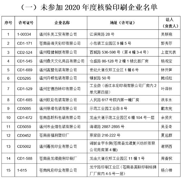 根據《浙江省新聞出版局關于開展2020年印刷企業年度報告和國家印刷示范企業年度考核工作的實施方案》和《國家新聞出版署關于開展2020年印刷企業年度報告、互聯網平臺公示試點和國家印刷復制示范企業年度考核工作的通知》(國新出發電〔2019〕43號)文件要求,我局按規定開展印刷企業和出版物發行單位的年度核驗工作。截至目前,仍有15家印刷企業和9家出版物發行單位經多次催辦,未按規定參加年度核驗。