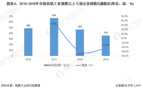 從近幾年的具體數據來看,2016-2019年我國造紙工業規模以上虧損企業數量總體呈逐年增長態勢,增速波動較大。2018年行業規模以上虧損企業數量達543家,同比增長93.2%,受宏觀環境消極影響較大。2019年我國造紙工業規模以上虧損企業數量為560家,同比上漲3.1%。