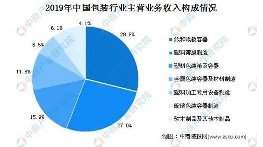 數(shù)據(jù)來源:中商產(chǎn)業(yè)研究院整理 細(xì)分領(lǐng)域分析 2019年,全國包裝行業(yè)完成累計營業(yè)務(wù)收入10,032.53億元,同比增長1.06%,同比增長1.06%,增速比去年同期降低了5.47個百分點。其中,紙和紙板容器的制造占比28.88%;塑料薄膜制造占比26.96%;塑料包裝箱及容器制造占比15.87%;金屬包裝容器及材料制造占比11.64%;塑料加工專用設(shè)備制造占比6.49%;玻璃包裝容器制造占比6.08%;軟木制品及其他木制品占比4.1%。