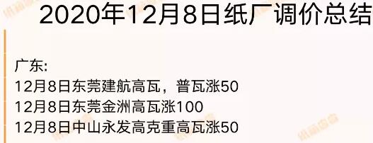 導(dǎo)語(yǔ):12月才過去10天,東莞四小龍?jiān)堃呀?jīng)漲了3次,如此頻繁連漲,背后是陰謀?還是信心使然? 1、12月僅過10天,東莞四小龍?jiān)堃呀?jīng)漲了3次 據(jù)“紙箱查查”消息:12月8日起,廣東部分紙廠原紙價(jià)格上調(diào)50-100元/噸,市場(chǎng)漲聲不斷,預(yù)計(jì)這波漲價(jià)潮面積將進(jìn)一步擴(kuò)大。