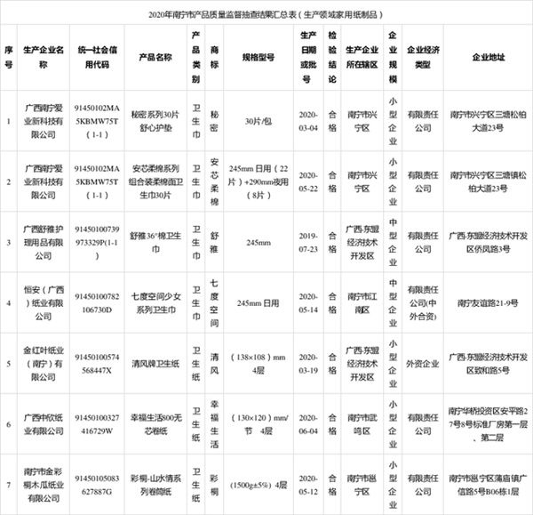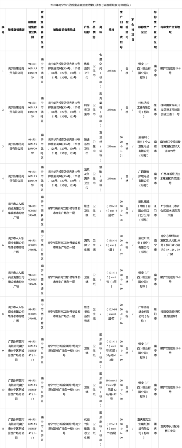 2020年12月31日,廣西南寧市市場監(jiān)督管理局網(wǎng)站公布2020年家用紙制品產(chǎn)品質(zhì)量監(jiān)督抽查情況,共抽查18批次樣品,其中8批次為衛(wèi)生巾(含衛(wèi)生護(hù)墊)產(chǎn)品、10批次為衛(wèi)生紙產(chǎn)品。經(jīng)檢驗(yàn),18批次均為合格產(chǎn)品,不合格產(chǎn)品檢出率為0。其中,生產(chǎn)領(lǐng)域共抽取7批次產(chǎn)品,合格7批次,不合格0批次,不合格產(chǎn)品檢出率為0;流通領(lǐng)域共抽取11批次產(chǎn)品,合格11批次,不合格0批次,不合格產(chǎn)品檢出率為0。