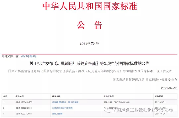 4月13日,國家標準化管理委員會發布2021年第4號國家標準公告,批準了GB/T 28004.1—2021《紙尿褲 第1部分:嬰兒紙尿褲》。請各相關單位積極組織實施。