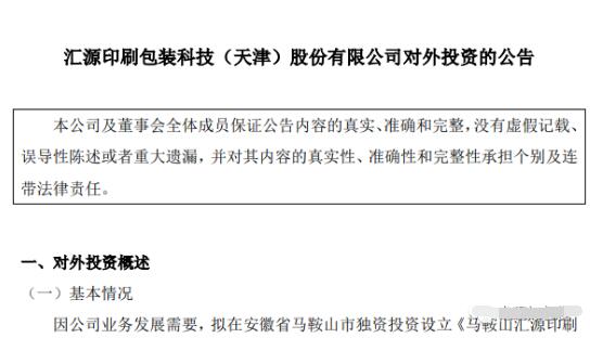 在公告中,匯源印刷包裝科技(天津)股份有限公司稱,本次對外投資是公司從長遠發(fā)展利益出發(fā),以適應客戶需求和擴大公司業(yè)務運營規(guī)模的重要經(jīng)營行為,有助于提升公司的綜合實力與競爭力,對公司未來業(yè)績和收益的增長具有積極意義。