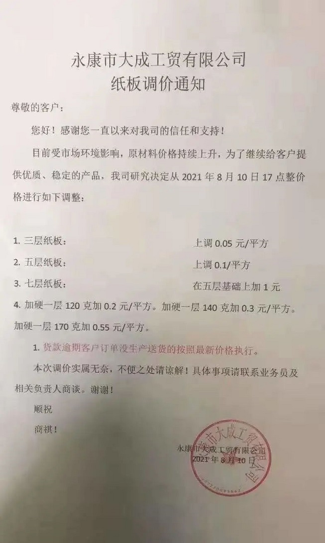 自8月5日漲價后,玖龍再發(fā)通知:天津玖龍8月12日24點出庫起,牛卡、再生箱板紙、瓦楞上調(diào)100元/噸。這是天津玖龍本月第二次上調(diào),累計漲幅300元! 與此同時,包括重慶、太倉等在內(nèi)的其他幾大玖龍基地均官宣漲價消息,漲幅50-150元,其中: 太倉玖龍紙業(yè):牛卡價格上調(diào)100元/噸,其他箱板瓦楞紙價格上調(diào)50元/噸。 重慶玖龍紙業(yè):牛卡、再生箱板紙價格上漲150元/噸,瓦楞紙價格上漲100元/噸。 沈陽玖龍紙業(yè):海龍牛卡、地龍牛卡價格上漲100元/噸,再生箱板紙、瓦楞紙價格上漲150元/噸。 旺季臨近,二級廠加緊屯倉,各規(guī)模紙廠成品紙出貨量很好,庫位見低,甚至出現(xiàn)爆單的情況!種種利好需求讓玖龍實現(xiàn)一周兩連漲。 原紙價格上漲帶動紙板廠成本上行,新一波漲價函持續(xù)加入這股大潮……