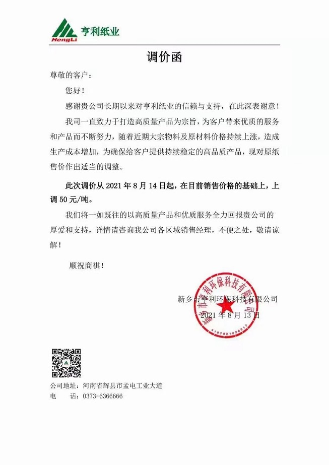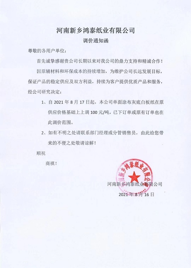 8月初至今瓦楞紙及箱板紙中小企業(yè)相繼上調(diào)紙價50-150元/噸,天津玖龍于本月5日上調(diào)瓦楞紙及箱板紙價格100-200元/噸,山鷹紙業(yè)于本月11日起上調(diào)瓦楞紙及箱板紙價格100元/噸,另有部分紙企取消上月優(yōu)惠政策。市場頻頻出現(xiàn)提價動作,傳統(tǒng)旺季金九銀十能否會如期而至呢? 漲價函: 河南新鄉(xiāng)鴻泰紙業(yè)有限公司 從8月17日起,單面涂布灰底白板紙在原供應(yīng)價格基礎(chǔ)上上調(diào)100元/噸。
