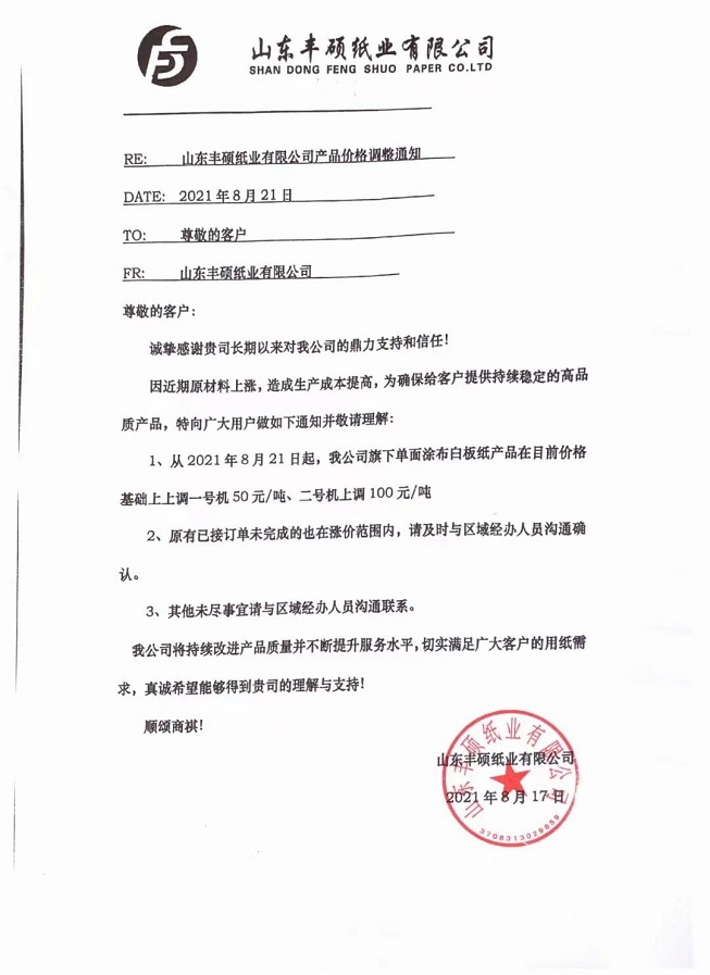 山東豐碩紙業(yè)有限公司 從8月17日起,一號機生產(chǎn)的單面涂布白板紙產(chǎn)品在目前價格基礎(chǔ)上上調(diào)50元/噸。