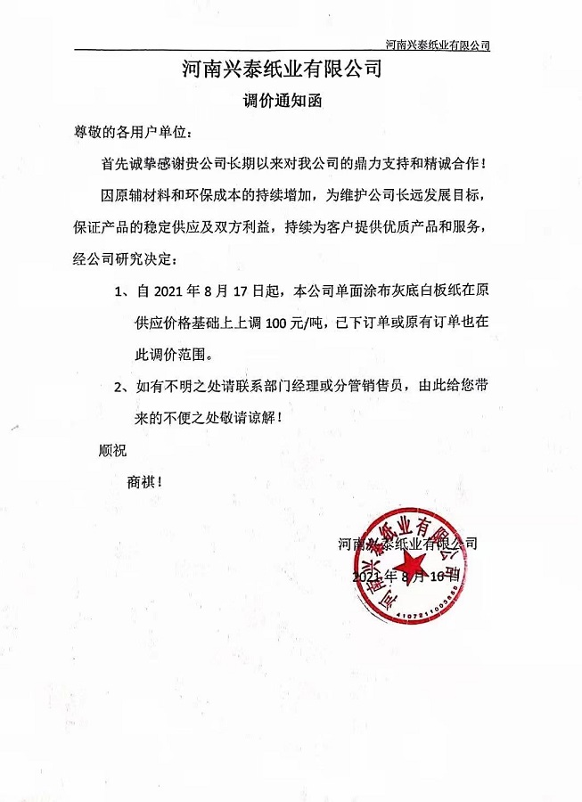 河南興泰紙業(yè)有限公司 從8月17日起,單面涂布灰底白板紙在原供應(yīng)價格基礎(chǔ)上上調(diào)100元/噸。