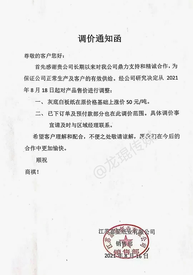 江蘇富星紙業(yè)有限公司 從8月18日起,灰底白板紙在原價格基礎(chǔ)上漲價50元/噸,已下訂單及預(yù)付款部分也在此調(diào)價范圍。