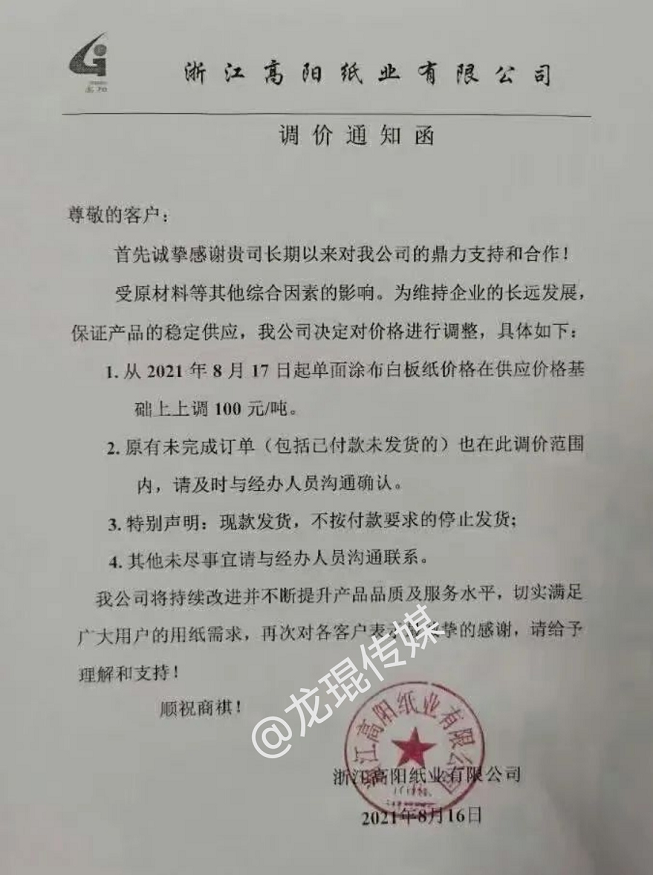 浙江高陽紙業(yè)有限公司 從8月17日起,單面涂布白板紙在供應(yīng)價格基礎(chǔ)上上調(diào)100元/噸。