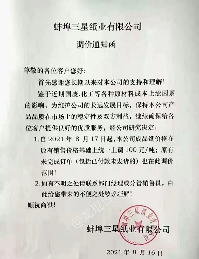 蚌阜三星紙業(yè)有限公司 從8月17日起,成品紙價格在原有銷售價格基礎(chǔ)上統(tǒng)一上調(diào)100元/噸,原有未完成訂單(包括已付款未發(fā)貨)也在此調(diào)價范圍內(nèi)。