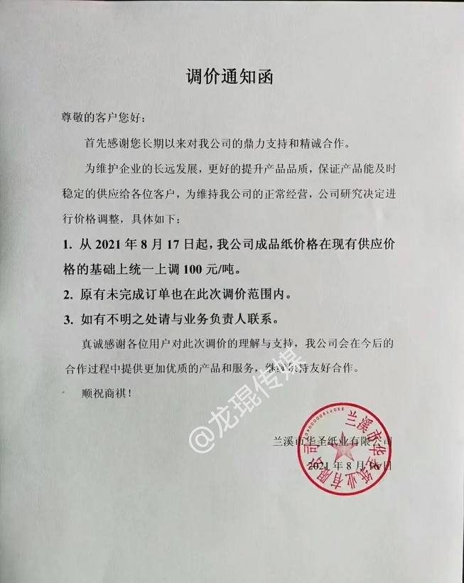 蘭溪市華圣紙業(yè)有限公司 從8月17日起,成品紙價格在現(xiàn)有價格基礎(chǔ)上統(tǒng)一上調(diào)100元/噸,原有未完成訂單也在此調(diào)價范圍內(nèi)。