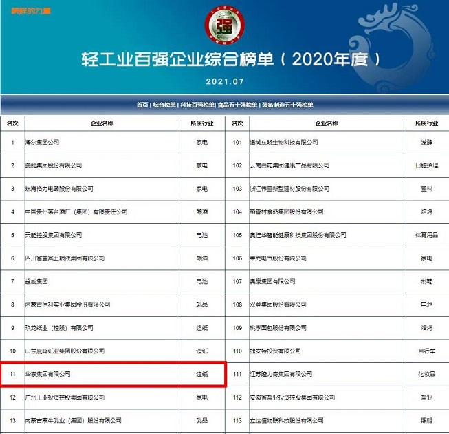 近期,中國輕工聯發布2020年度中國輕工業百強企業名單,華泰集團名列榜單第11名,在上榜的造紙企業中名列第3,這也是自2012年6月中國輕工業百強榜首次發布以來,華泰集團連續10年以優異成績名列榜單前茅。