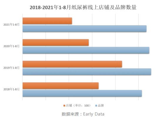 數據來源:Early Data 02、線上中小紙尿褲店鋪及品牌被淘汰 Early Data數據顯示,綜合阿里、京東兩大電商平臺,近年來線上紙尿褲品牌和店鋪數量在持續下降,自2019年1-8月年顯著增長,2020年1-8月線上紙尿褲店鋪數量大幅減少(-33.6%),今年1-8月延續跌勢(-25.2%)。從數據走勢可以看出,隨著行業洗牌期的來臨,線上紙尿褲市場正在淘汰競爭力較弱的店鋪和品牌,中小規模且自有生產線與產品品質匱乏的企業或將首當其沖。