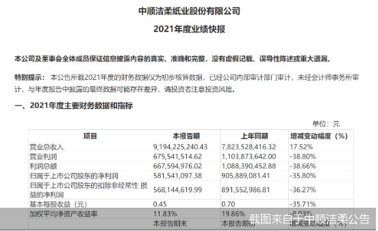 凈利下滑超三成,高管頻繁離職,素有“A股紙茅”的中順潔柔過去一年的發(fā)展似乎不太順利。2月28日,中順潔柔發(fā)布業(yè)績快報,凈利潤下滑超三成,這是自2015年以來,中順潔柔凈利潤首次出現(xiàn)負增長。 凈利潤下降三成 原料價格上漲成誘因 中順潔柔業(yè)績快報顯示,2021年度,其營業(yè)收入為91.94億元,較去年同期增長17.52%,歸屬于上市公司股東的凈利潤為5.82億元,較去年同期下降35.8%。