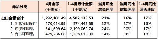 2022年4月,國內(nèi)印刷品出口12.92億美元(參見表3),環(huán)比增長21%、同比增長16%。其中,出版物印刷品出口1.71億美元(環(huán)比下增長32%、同比增長27%)、包裝印刷品出口6.42億美元(環(huán)比增長24%、同比增長20%)、商業(yè)印刷品出口4.80億美元(環(huán)比增長14%、同比增長8%)。 表3 2022年4月國內(nèi)印刷品出口統(tǒng)計(jì)