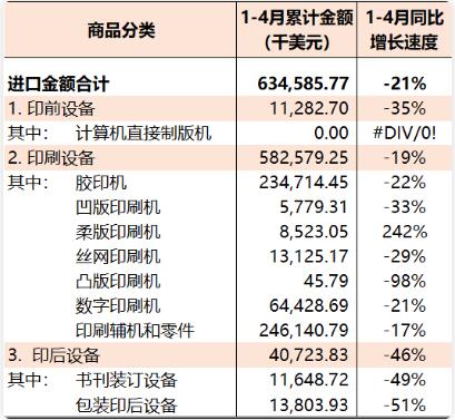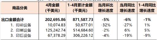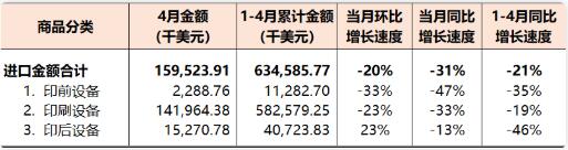 印刷裝備 2022年4月,國內(nèi)印刷裝備進(jìn)口1.60億美元(參見表4),環(huán)比下降20%、同比下降31%。其中,印前設(shè)備進(jìn)口228.88萬美元(環(huán)比下降33%、同比下降47%)、印刷設(shè)備進(jìn)口1.42億美元(環(huán)比下降23%、同比下降33%)、印后設(shè)備進(jìn)口1527.08萬美元(環(huán)比增長23%、同比下降13%)。 表4 2022年4月國內(nèi)印刷裝備進(jìn)口統(tǒng)計(jì)