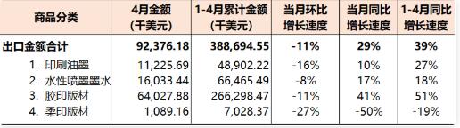 2022年1-4月,國內(nèi)印刷器材出口3.89億美元(參見表7),同比增長39%。其中,黑色印刷油墨861.24噸、425.32萬美元(同比增長1%)、其他印刷油墨7797.14噸、4464.90萬美元(同比增長30%)、水性噴墨墨水8726.74噸、6646.55萬美元(同比增長18%)、PS膠印版材1488.15萬平方米、4773.67萬美元(同比增長40%)、CTP膠印版材6053.65萬平方米、2.19億美元(同比增長54%)、柔印版材16.62萬平方米、702.84萬美元(同比下降19%)。 表13 2022年1-4月國內(nèi)印刷器材出口統(tǒng)計(jì)