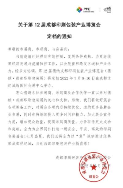 各位關(guān)心和支持 德納·成都印刷包裝展的朋友們, 久等啦! 當(dāng)前疫情已經(jīng)得到有效控制,復(fù)展條件成熟 為更好統(tǒng)籌經(jīng)濟(jì)發(fā)展與疫情防控工作, 以會展重啟激發(fā)區(qū)域和產(chǎn)業(yè)活力, 國內(nèi)多個城市恢復(fù)舉辦展會。 經(jīng)多方協(xié)調(diào), 第12屆成都印刷包裝產(chǎn)業(yè)博覽會定檔啦!