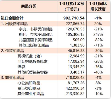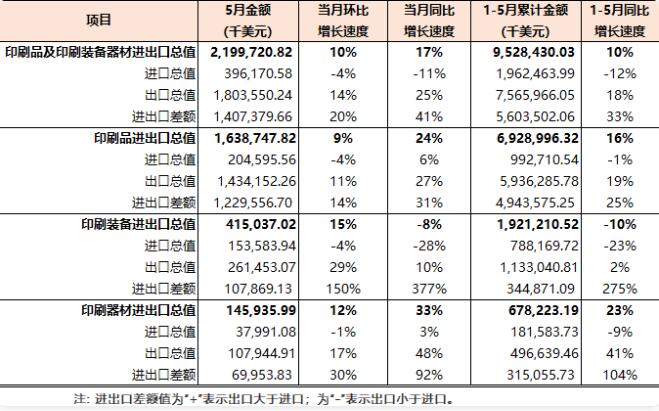 2022年1-5月國內(nèi)印刷器材進(jìn)出口貿(mào)易順差3.15億美元(同比增長104%)。 本期觀察 2022年1-5月國內(nèi)印刷產(chǎn)業(yè)相關(guān)商品進(jìn)出口同比增長10%,與上期(1-4月)相比,提升了2個百分點。而拉動其提升的主要動力來自印刷品、印刷裝備、印刷器材三大類商品的出口增長。 本期,國內(nèi)印刷產(chǎn)業(yè)相關(guān)商品進(jìn)出口貿(mào)易特點如下: 三大類商品進(jìn)口速度相對萎縮的態(tài)勢未見根本改觀:1-5月份,國內(nèi)印刷產(chǎn)業(yè)相關(guān)商品進(jìn)口同比下降12%。其中,印刷品進(jìn)口同比下降1%(較上期上升2個百分點)、印刷裝備同比下降23%(較上期降低2個百分點)、印刷器材同比下降9%(較上期提高2個百分點)。 印刷品、印刷器材出口繼續(xù)大幅增長、印刷裝備出口增長速度由負(fù)轉(zhuǎn)正:1-5月份,國內(nèi)印刷品和印刷器材的出口同比增長速度分布為19%和41%。同時,國內(nèi)印刷裝備出口由上期的負(fù)增長(-1%)轉(zhuǎn)變?yōu)檎鲩L(2%)。 亞洲、歐洲和北美的市場穩(wěn)固,拉美和非洲市場增長顯著:1-5月份,國內(nèi)印刷品、印刷裝備、印刷器材進(jìn)出口在亞洲、歐洲和北美洲三大區(qū)域市場的分布相對穩(wěn)定(亞洲43%、歐洲22%、北美洲24%)。與去年同期相比三個市場相關(guān)進(jìn)出口增長情況為,亞洲2%、歐洲10%、北美洲增長19%。同時,在拉丁美洲和非洲市場,國內(nèi)印刷產(chǎn)業(yè)相關(guān)商品進(jìn)出口表現(xiàn)亮眼,其增長速度分別達(dá)到35%和16%。 與2021年同期相比,2022年1-5月國內(nèi)印刷品、印刷裝備、印刷器材進(jìn)口和出口增長較快的前五個商品商品類別如下: 進(jìn)口:期刊及雜志類印刷品(+247%)、PS膠印版材(+125%)、柔版印刷機(jī)(+42%)、辦公類印刷品(+8%)、水性噴墨墨水(+1%); 出口:膠印機(jī)(+59%)、CTP膠印版材(+54%)、PS膠印版材(+49%)、柔版印刷機(jī)(+41%)、紙袋(+34%)。 同期,國內(nèi)印刷品、印刷裝備、印刷器材進(jìn)口和出口相對萎縮的前五個商品商品類別如下: 進(jìn)口:凸印機(jī)(-98%)、兒童圖畫書類印刷品(-82%)、CTP膠印版材(-78%)、其他出版物印刷品(-71%)、包裝印后設(shè)備(-55%); 出口:其他出版物印刷品(-62%)、票證類印刷品(-58%)、期刊及雜志類印刷品(-39%)、柔印版材(-14%)、書刊裝訂設(shè)備(-13%)。