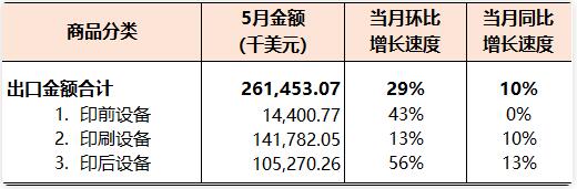 2022年5月國內(nèi)印刷裝備出口2.61億美元(參見表5),環(huán)比增長29%、同比增長10%。其中,印前設(shè)備出口1440.08萬美元(環(huán)比增長43%、同比增長0%)、印刷設(shè)備出口1.42億美元(環(huán)比增長13%、同比增長10%)、印后設(shè)備出口1.05億美元(環(huán)比增長56%、同比增長13%)。 表5 2022年5月國內(nèi)印刷裝備出口統(tǒng)計