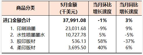 印刷器材 2022年5月國內(nèi)印刷器材進(jìn)口3799.11萬美元(參見表6),環(huán)比下降1%、同比增長3%。其中,印刷油墨進(jìn)口2303.17萬美元(環(huán)比下降9%、同比增長9%)、水性噴墨墨水進(jìn)口1072.78萬美元(環(huán)比增長5%、同比下降5%)、膠印版材進(jìn)口53.61萬美元(環(huán)比增長58%、同比下降37%)、柔印版材369.55萬美元(環(huán)比增長40%、同比增長6%)。 表6 2022年5月國內(nèi)印刷器材進(jìn)口統(tǒng)計