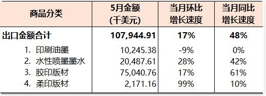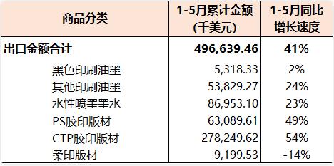 2022年1-5月國內(nèi)印刷器材出口4.97億美元(參見表7),同比增長41%。其中,黑色印刷油墨1096.28噸、531.83萬美元(同比增長2%)、其他印刷油墨9437.10噸、5382.93萬美元(同比增長24%)、水性噴墨墨水11366.92噸、8695.31萬美元(同比增長23%)、PS膠印版材1944.75萬平方米、6308.96萬美元(同比增長49%)、CTP膠印版材7656.55萬平方米、2.78億美元(同比增長54%)、柔印版材22.40萬平方米、919.95萬美元(同比下降14%)。 表13 2022年1-5月國內(nèi)印刷器材出口統(tǒng)計
